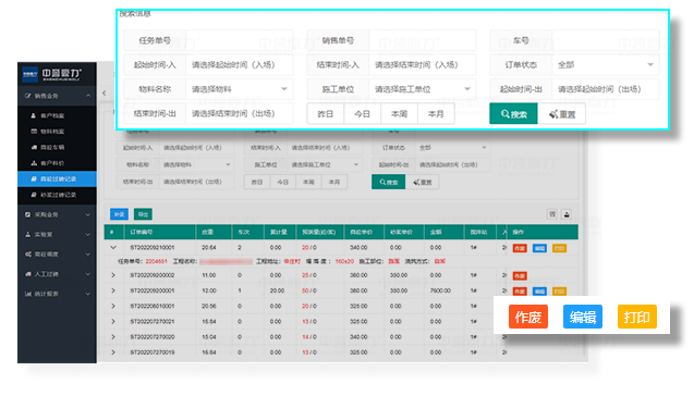 搜索:任務(wù)單號、銷售單號、車號、自定義時(shí)間段、訂單狀態(tài)、物料名稱、施工單位等快捷搜索;